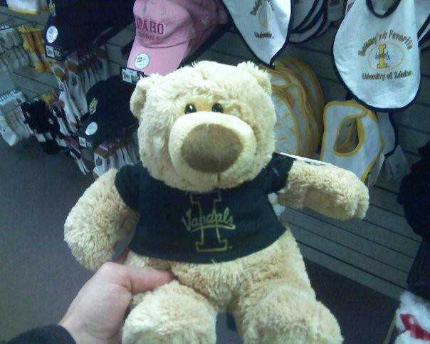 They had the kind where you could buy a bear and pick out his outfit and had a cheerleader and soccer uniform, a T-shirt, a sweater and a jacket to pick from to make him wear. My first thought was to get her a bear dresssed as an Idaho cheerleader, however, I'm pretty sure he's a guy bear and he has a beer (or is it honey?) belly and so he looked pretty silly in a cheerleading outfit, so I got him sporting an Idaho T-shirt.
