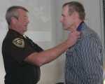 Elmore County Sheriff Rick Layher presents the law enforcement Purple Heart to Deputy Allen Long during a ceremony Friday morning. The deputy received the medal for injuries he sustained while responding to the Teapot Dome fire in the summer of 2012. As a result of the injuries he sustained, Long concluded his law enforcement career following 25 years on the force... -
