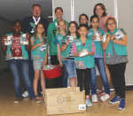 Local Girl Scout group leaders Sabrina and Phil Bonn are joined by Bugambilia Tapia, Keva Jackson, Amanda Bonn, Jessica Taylor, Alexis Nakaishi, Alexis Saterfield, Maya McCray and Kassidy Owens as they present bags filled with personal hygiene items to West Elementary School Principal Nikki Cruser during a recent meeting. ...