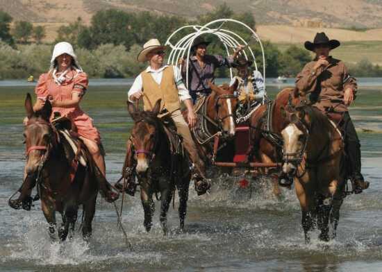 Wagon, riders cross Snake River during pioneer reenactment
