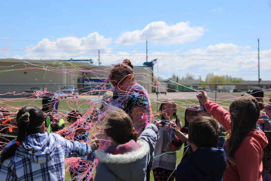 Students from Travis Henke's classroom douse West Elementary School Principal Nikki Cruser with Silly String on Friday after the fourth graders collected the most box tops and soup labels during a recent challenge among the classrooms. In one month, the students collected approximately 1,000 Box Tops for Education coupons along with Campbell Soup labels.