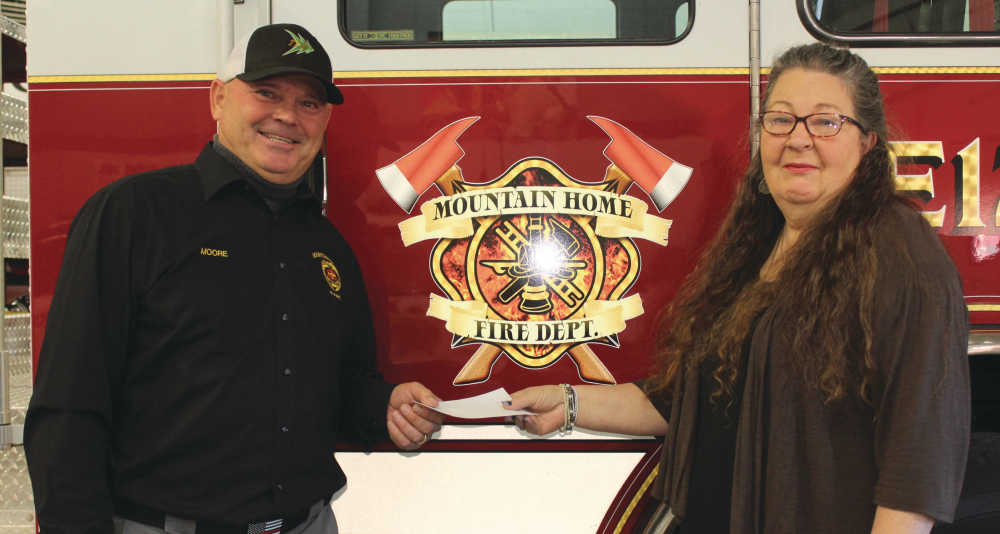 Fire Chief Mark Moore, left, receives a check from Mountain Home News Publisher Brenda Fincher for Mountain Home Fire Department's burnout fund.For the full story, pick up a copy of the Mountain Home News or click on this link to subscribe to the newspaper's online edition.