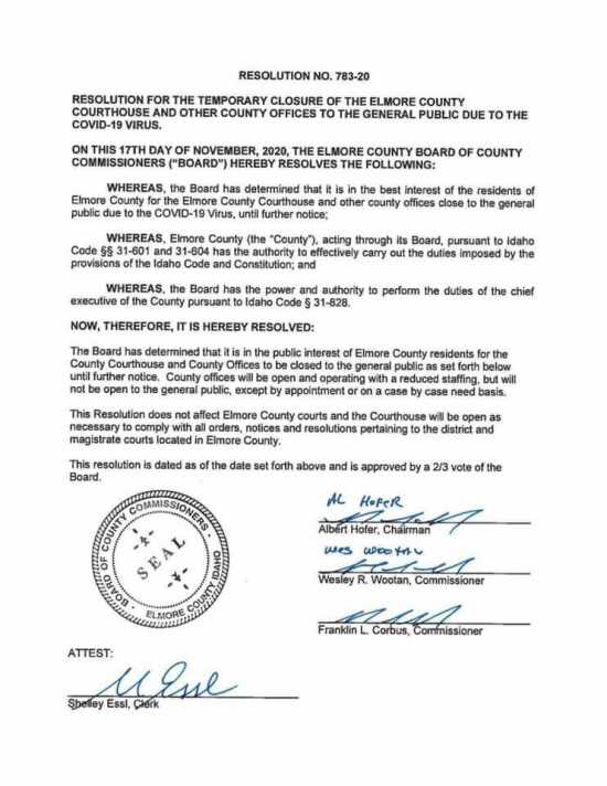 Elmore County Commissioners issue Resolution No. 783-20 for the temporary closure of Elmore County Courthouse and Office due to Covid19