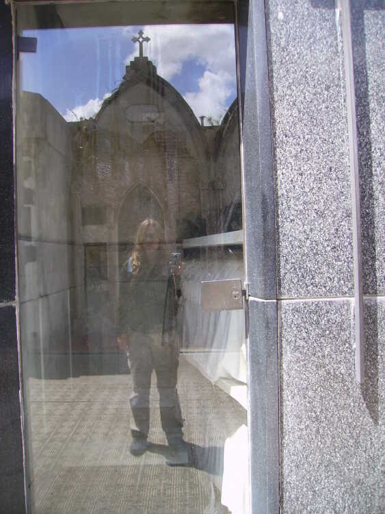 I followed a tour for awhile, then broke away to take pictures. It gave me chills when I saw my own reflection on the glass door of a moseleum, my own image superimposed over that of death and I realized that some day I will be in something like that as well. As I was wandering in the less traficked part of the cementary, an old man approached me. He explained to me that he had been working in the cementary for 12 years as a caretaker and gave me a personalized tour, explaining the imported architecture, interesting family histories, and how the people died. Then he took out a huge ring of keys. As the door of a black marble mosoleum swung open, chills ran through my body again.