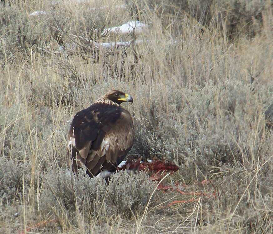 ...what we saw on the road home from Prairie, yesterday afternoon. He was about 25 yards from the road; it's been confirmed that he is a Golden Eagle...and he was not happy that I disturbed his meal! He flew over me, low and returned to the area. We left him at peace to enjoy whatever it was that he was eating.