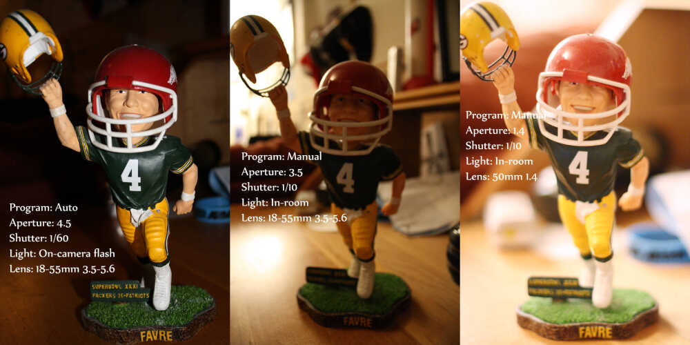 If you buy the same camera as me and stick it on Auto with the kit lens, do not necessarily expect our photos to look the same. Take the three images of Favre. All three were taken in the same room about a minute apart (I took 1 and 3 first, and then decided to take 2).