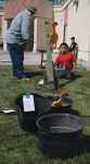 Pete Humm provides a few pointers as Juan Sedano uses a scaled-down catapult to launch rubber chickens into various targets as the youngster took part in the library's Dangerous Day for Boys event.