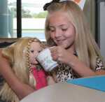 Keira Fryer pretends to serve tea to her doll, Holly Lynn, prior to the start of Saturday's formal tea. The event marked the introduction this year of an American Girl known as Julie, whose stories take part in the 1970s. As part of this year's tea, participants were invited to dress up in '70s-era fashions.