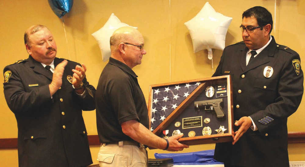 Police Lt. Humberto Fuentes joins Police Lt. Jesse Cobos as they present a shadow box containing various memorabilia to Police Cpl. Stan Winings, who was honored by local officials during a ceremony on Friday. Winings will retire from the Mountain Home Police Department following a total of 33 years of service to the Mountain Home community, which includes his time as a reserve officer.