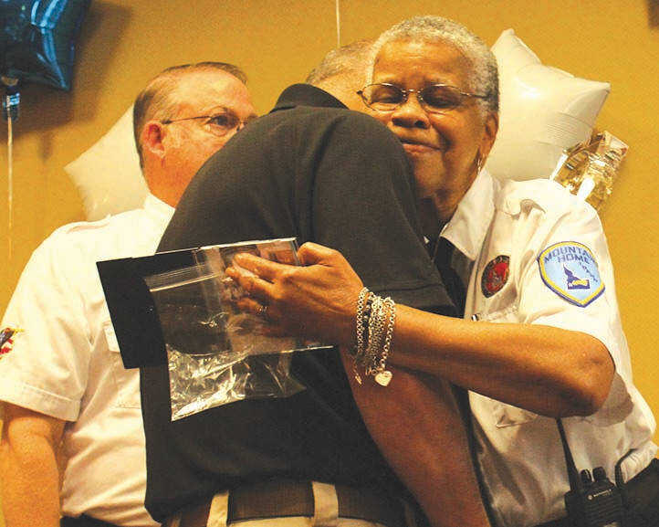 Winings receives a hug from Sadu Simpson as she and members of the Mountain Home Citizens on Patrol team made a presentation to the retiring officer. During the ceremony, officials paused to reflect on the difference Winings made to the Mountain Home community. They recognized his efforts to create the Citizens on Patrol program here 20 years ago along with serving on the community's bike patrol. Police Chief Nick Schilz also honored the police corporal's volunteer service with the Elmore Ambulance Service — a duty he still performs.