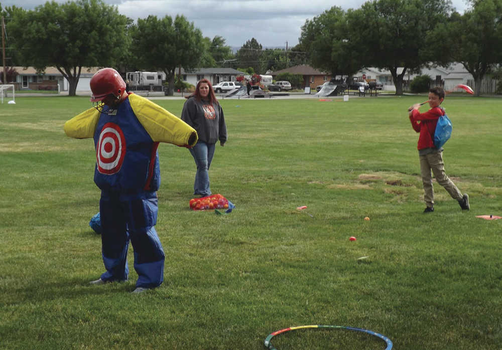 At left, Jeffrey Worthan plays the role of a human target for golfers like Ben Randal. Snag golf was just one of the many activities set up that day, which also included volleyball, hula hoops, bowling, horseshoes and a fireman hose tug of war.