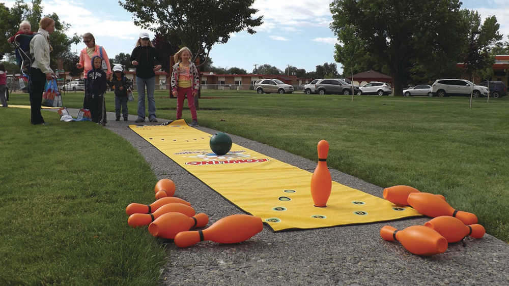 A youngster bowls for a spare at one of the activity stations set up at the field next to the local hospital.