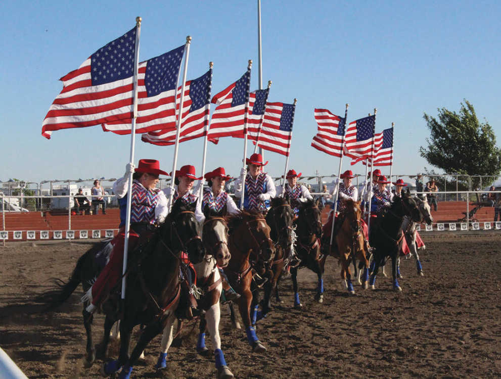 Members of the Treasure Valley Leather Slappers equestrian team present the Stars and Stripes in a synchronized show set to music to mark the official start of this year's rodeo.