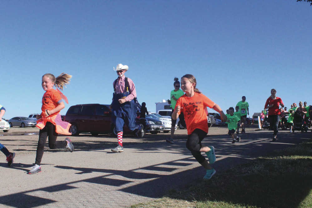 Youngsters are joined by rodeo clown John Beck as they complete the dash back to Optimist Park as they finish Second Annual Run With the Bulls fun run on Saturday. Held in conjunction with this year's Daniel Dopps Memorial Rodeo, children were invited to tackle a one-mile course with a five-kilometer option available for older participants.