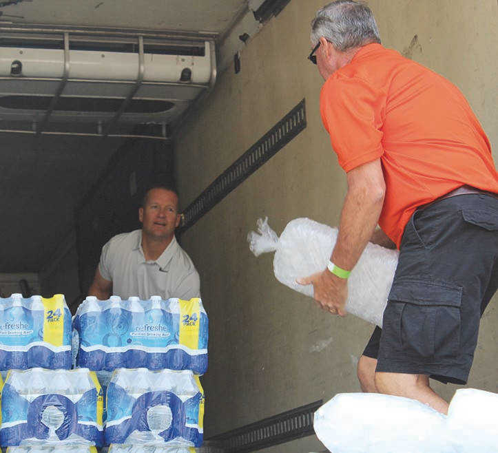 Mayor Rich Sykes, left, helps unload a truck filled with water, ice and kegs before the festival begins.