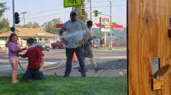 Rick VanMeer watches as Emili Warburton tests her marksmanship skills as she directs a stream of water into a simulated building. Her goal involved knocking down the simulated flames rising out of the home.
