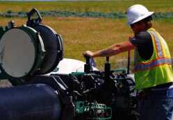 A member of the construction team welds sections of water pipe together along Idaho State Highway 167.