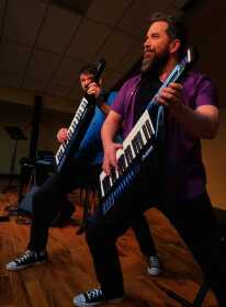 Patrick Courtin and Nico Rhodes get into character as they prepare to entertain the audience as they presented the “Piano Heist” concert Thursday evening.