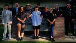 Braxton Jones, Autumn Cummins, Kade Dexter and Faith Zakrzewski join city and county officials for a photo after the middle school students gained the honorary titles of the city’s mayor, the county sheriff as well as the city’s fire and police chiefs.