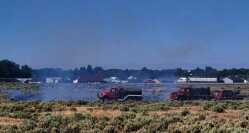 City firefighters work to contain a range fire near Northeast Frontage Road last week that began after a tire on a semi trailer driving on the interstate broke off and got thrown into a patch of dry vegetation about 200 yards off the highway.