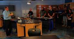Dennis Wilson, superintendent of the Richard McKenna Charter School District, left, highlights elements of the charter high school’s science classroom during the open house event held Friday afternoon.