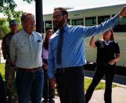 Congressman Mike Simpson listens as Mountain Home School District Superintendent James Gilbert discusses how Stephensen Elementary School supports the children of military families during the federal lawmaker’s visit to Mountain Home Air Force Base on Thursday.