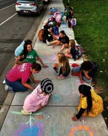 Students from local area schools join together as they write various messages of hope and support on the sidewalk along one of the city’s schools as they take part in the city-wide Chalk the Walk event on Sept. 10.