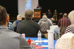 Local military veterans and their spouses listen as retired Chief Master Sgt. Allen Niksich speaks at the Veterans Day event at Mountain Home High School on Nov. 11. During his speech, Niksich highlighted the memory of Ray Sulfridge, a local military veteran who served during World War II, the Korean War and the Vietnam War.