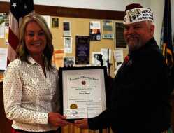 Ralph Binion, commander of the Veterans of Foreign Wars Post 5423, presents Sherri Ybarra with this year’s teacher of the year honor during a recent ceremony.