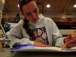 Gracie Allen, a sophomore at Mountain Home High School, works on a hand-drawn portrait of herself as well as her younger sister, Molly, as the student takes part in the Youth Art Show held Saturday at the high school.