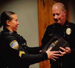 During a ceremony held at the start of a city council meeting Jan. 27, Mountain Home’s interim Police Chief Ty Larsen recognized Police Cpl. Lyndsi Tacke as the department’s law enforcement officer of the year.